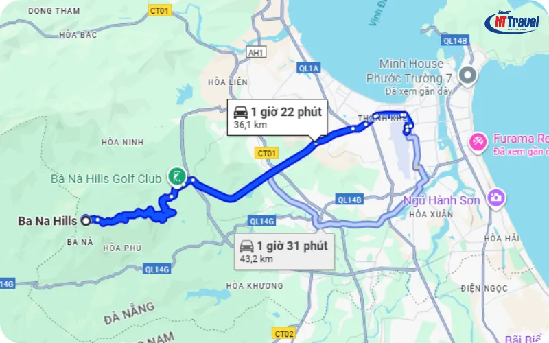 Từ trung tâm thành phố Đà Nẵng, du khách có thể dễ dàng di chuyển đến khu du lịch Bà Nà Hills. Quá trình di chuyển kéo dài khoảng 30 – 40 phút, giúp du khách tận hưởng không gian thoáng mát cùng phong cảnh tuyệt đẹp của Đà Nẵng.