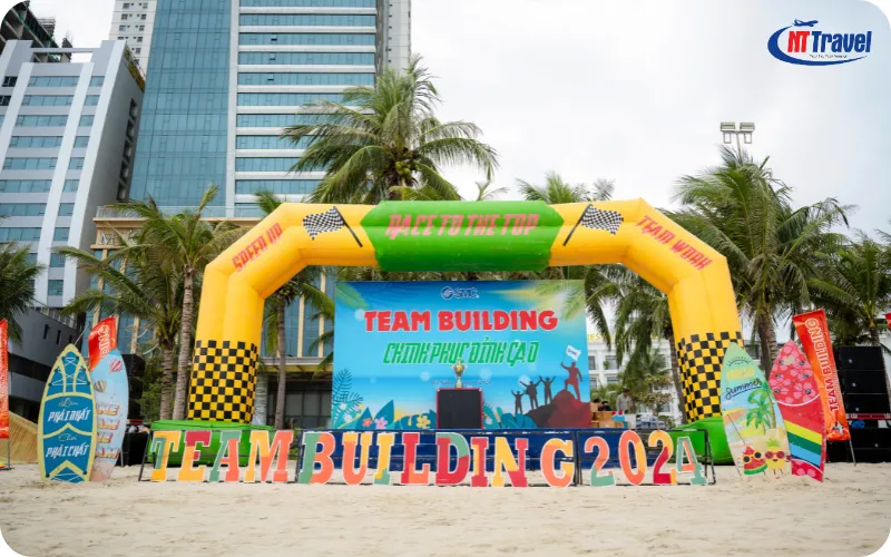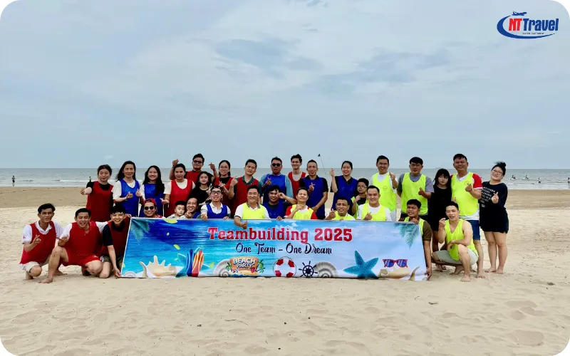- Slogan theo địa điểm: Như slogan team building bãi biển sẽ có những câu như “Biển xanh – Đoàn kết – Chất lượng” hay “Hòa mình vào biển cả, gắn kết trái tim”, tạo sự hòa hợp với không gian tổ chức.